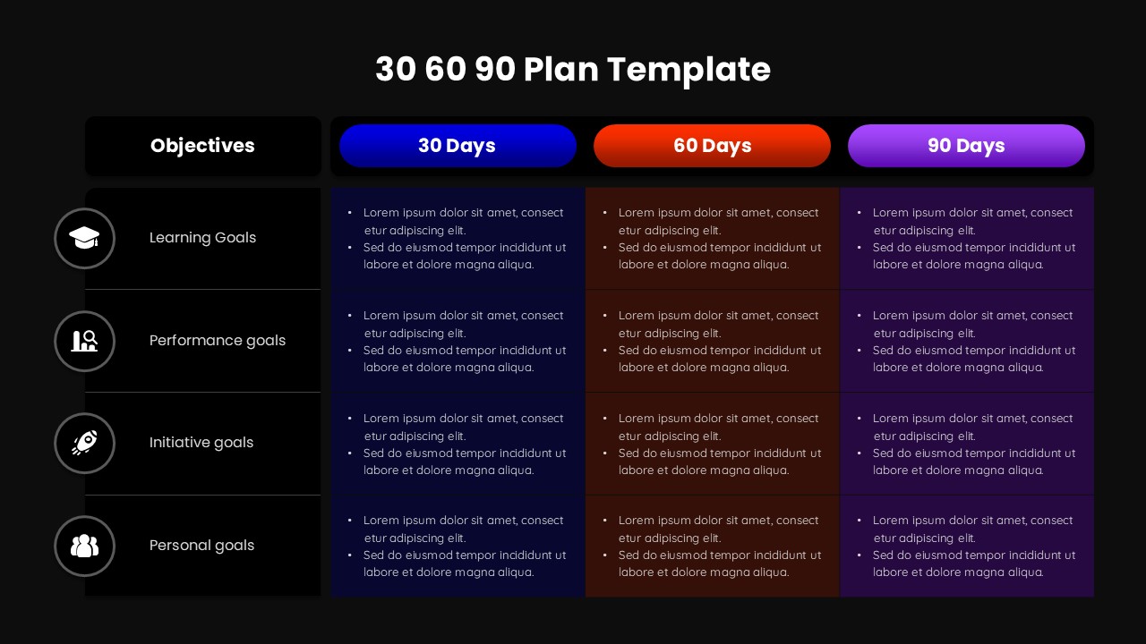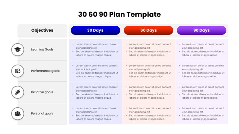 The template features a structured table layout divided into 30 day, 60 day, and 90 day columns, each aligned against a dedicated objectives column. Rows are organized by goal categories such as learning, performance, initiatives, and personal development, allowing users to clearly map expectations over time. Each section provides space for concise bullet style entries, enabling teams or individuals to outline responsibilities, milestones, and focus areas without overcrowding the slide. The visual hierarchy ensures immediate readability during presentations or reviews.