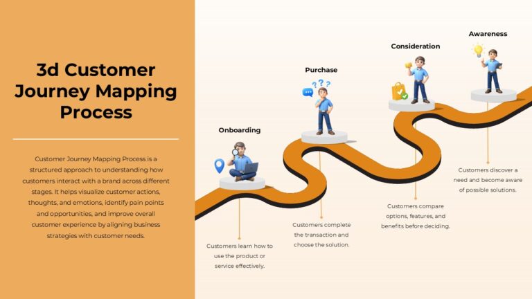 This 3D Customer Journey Mapping Process template illustrates the full customer lifecycle in a visually engaging format. It is a fully editable presentation template, compatible with both PowerPoint and Google Slides. The design supports teams seeking to understand customer behavior across awareness, consideration, purchase, and onboarding stages. It helps presenters communicate journey insights clearly while aligning strategic decisions with customer needs. The template provides a structured visual path that highlights the emotions, actions, and touchpoints guiding customers from initial discovery to product adoption. Its three dimensional scene enhances clarity and supports stakeholder discussions around pain points, opportunities, and experience improvements.