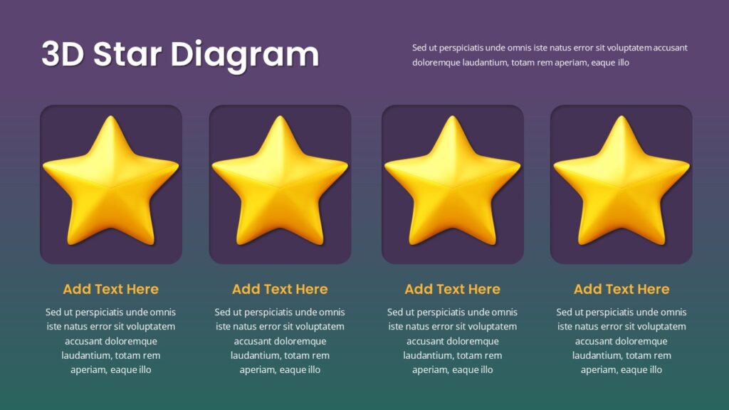 The template includes a single featured slide displaying four 3D stars arranged horizontally across the page. Each star is placed within a rounded rectangle that subtly lifts it off the background, creating a sense of depth. Below each star is a title placeholder followed by a text area for brief explanations. The gradient backdrop transitions from purple to teal, enhancing contrast and making the yellow stars stand out. The structure is evenly spaced and designed to maintain visual harmony, regardless of content length.