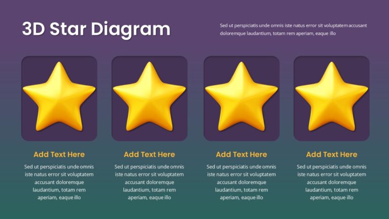 This template features a 3D star diagram designed to highlight four key points or categories in a visually engaging way. It is a fully editable presentation template, fully compatible with both PowerPoint and Google Slides. The layout uses vibrant golden 3D stars paired with modern gradient backgrounds to create a polished and dynamic visual effect. Its structure makes it ideal for showcasing achievements, rating systems, evaluation criteria, or milestone highlights.