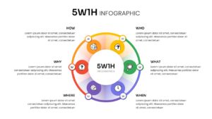 The slide highlights include a bold central title area, color coded circular segments, and intuitive icons representing each 5W1H element. The radial flow guides the audience naturally through each question, improving comprehension and engagement while maintaining a professional appearance.