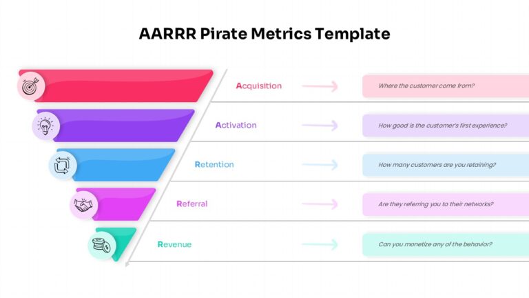 This AARRR (Acquisition, Activation, Retention, Referral, and Revenue) Pirate Metrics presentation template provides a structured visual funnel for analyzing customer behavior across five essential growth stages. It is a fully editable presentation template designed for seamless use in both PowerPoint and Google Slides, allowing teams to adjust text, colors, and layout elements with ease.