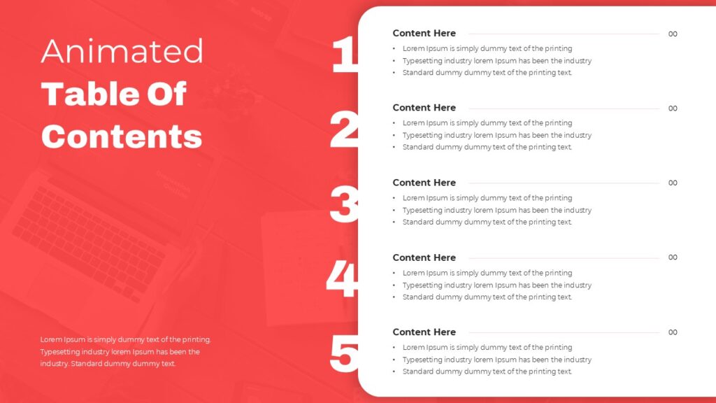 The template features a left aligned red background area with strong headline typography that introduces the table of contents. On the right side, a rounded white content panel organizes five numbered sections, each with space for a title and descriptive bullet points. Thin dividing lines offer subtle visual separation while maintaining harmony in the layout. The minimal aesthetic ensures the viewer’s attention moves effortlessly through the numbered structure, making it suitable for both simple and detailed presentations.
