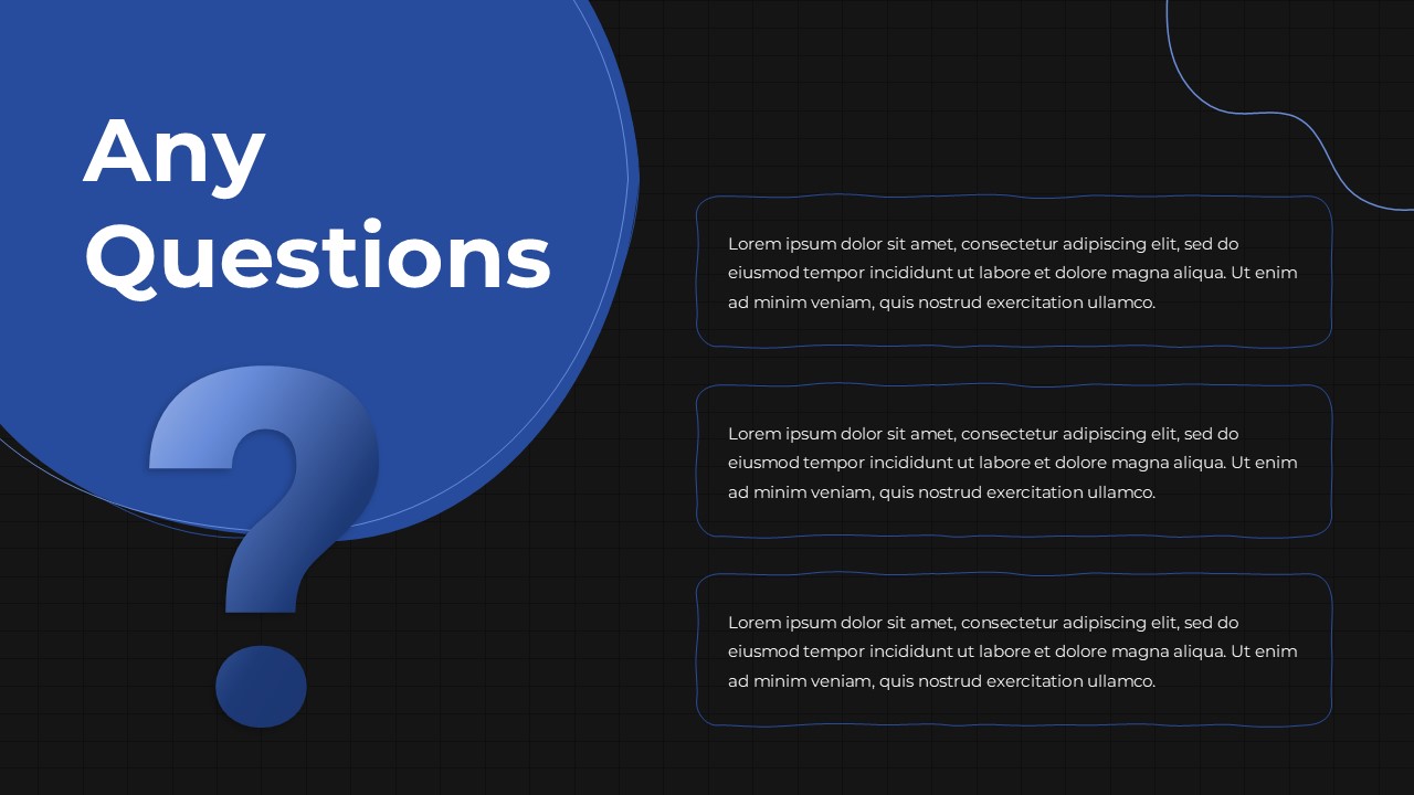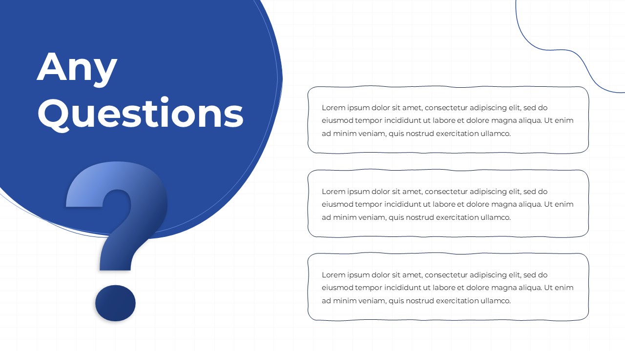 The large question graphic creates a strong focal point, signaling a natural pause in the presentation for feedback or inquiries. The three callout shapes allow presenters to highlight reminders, provide follow up actions, or share contact information. The overall structure helps maintain attention while ending the presentation on a clear and inviting note.