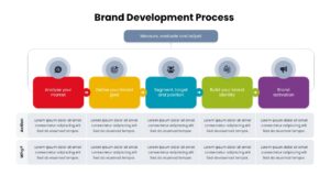 The layout is built around a step by step process that highlights how brands move from market analysis to measurable activation. Each stage is visually distinct, making complex brand strategy frameworks easier to understand and communicate. The clean structure supports both high level overviews and detailed explanations during presentations.