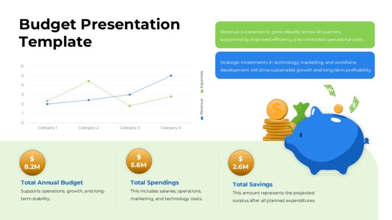 This budget presentation template provides a clear and structured way to communicate revenue trends, expenses, and projected savings while offering a fully editable layout suitable for a wide range of financial discussions. It is designed as a flexible presentation template that works seamlessly with PowerPoint and Google Slides, ensuring easy customization for different reporting needs. The template supports clear visualization of financial data, making it especially effective for planning, forecasting, and internal review. Its layout helps professionals present complex numbers with confidence while aligning with best practices for finance presentations. Following the opening visual summary, the template elaborates on financial performance drivers, projected growth patterns, and strategic considerations to support executive alignment and decision making.