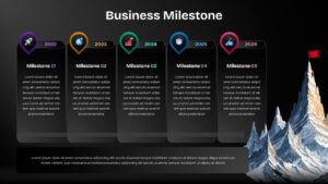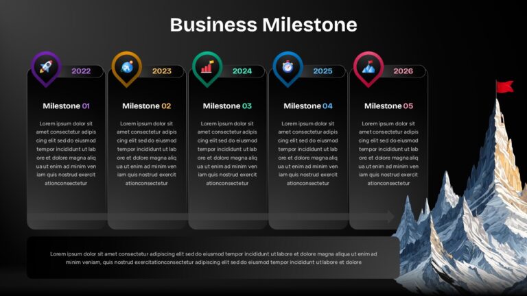 This professional Business Milestone template transforms your strategic planning presentations with a powerful mountain-climbing metaphor that resonates with achievement and progress. The template features a sophisticated timeline design with five distinct milestone cards, each representing crucial business phases from 2022 to 2026. The design combines modern aesthetics with practical functionality, offering both dark and light background variations to suit different presentation environments. This template is completely editable in both Microsoft PowerPoint and Google Slides, allowing you to customize every element to match your brand and specific milestone requirements. The visual storytelling approach makes complex business timelines engaging and memorable for stakeholders.