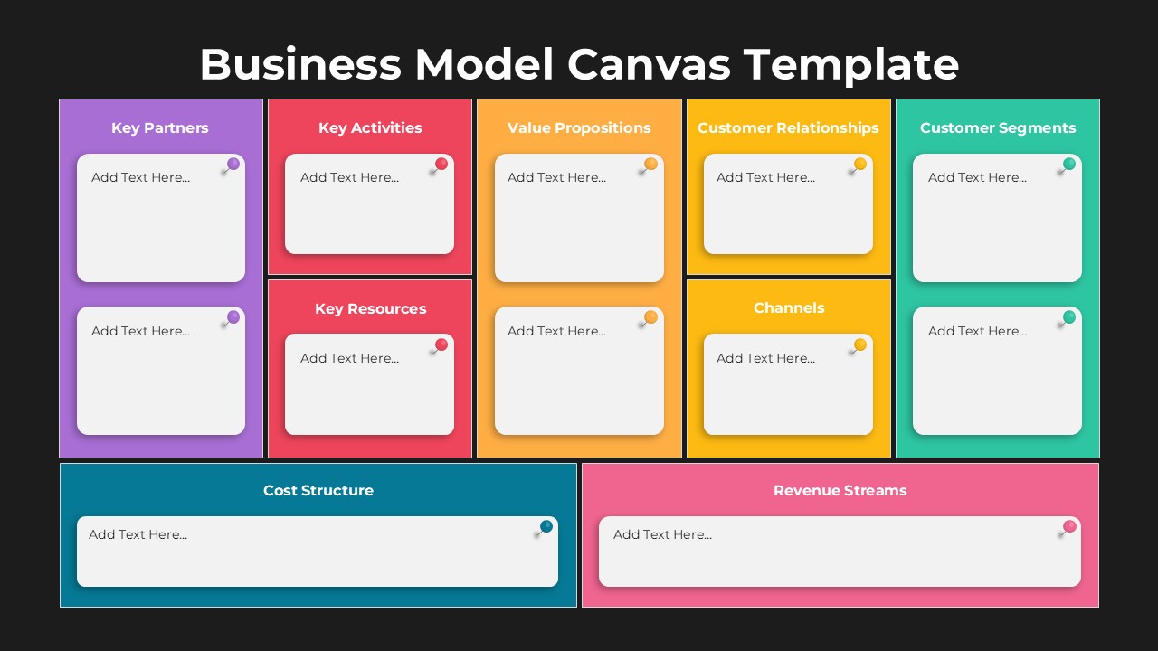 Visualize your company’s complete business structure with this vibrant Business Model Canvas Framework template. Designed around the nine core elements—Key Partners, Key Activities, Value Propositions, Customer Relationships, Customer Segments, Key Resources, Channels, Cost Structure, and Revenue Streams—this slide offers a clean, color-coded layout that enhances comprehension and presentation flow. Each segment is distinctly shaded in contrasting hues such as teal, yellow, purple, red, and pink to help viewers quickly identify and relate different operational components.