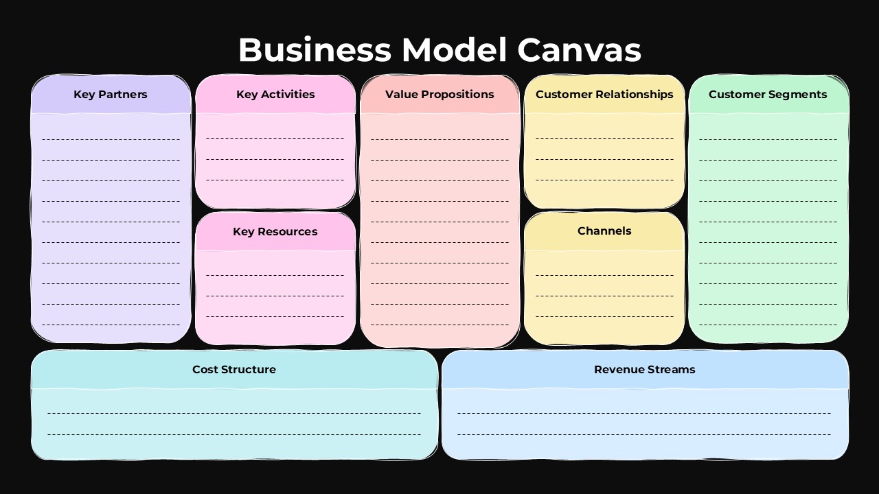 Present your complete business framework clearly with this Business Model Canvas Framework Template for PowerPoint & Google Slides. This professional slide design captures every core element of a business model—Key Partners, Key Activities, Value Propositions, Customer Relationships, Channels, Customer Segments, Key Resources, Cost Structure, and Revenue Streams—within an easy-to-follow layout. Each segment is color-coded for clarity, helping teams map, analyze, and communicate strategic plans efficiently. The pastel-toned boxes provide space for notes and ideas, making it ideal for brainstorming, workshops, and executive meetings.