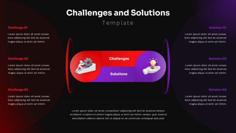 The template features a striking central capsule design with a red-to-purple gradient that serves as a visual bridge between challenges and solutions. Three challenge points appear on the left in red accent colors, while three solution points on the right use purple accents. The modern 3D isometric icons add depth and visual interest, while the clean typography ensures excellent readability. Both dark and light theme variations provide versatility for different presentation contexts and brand requirements.