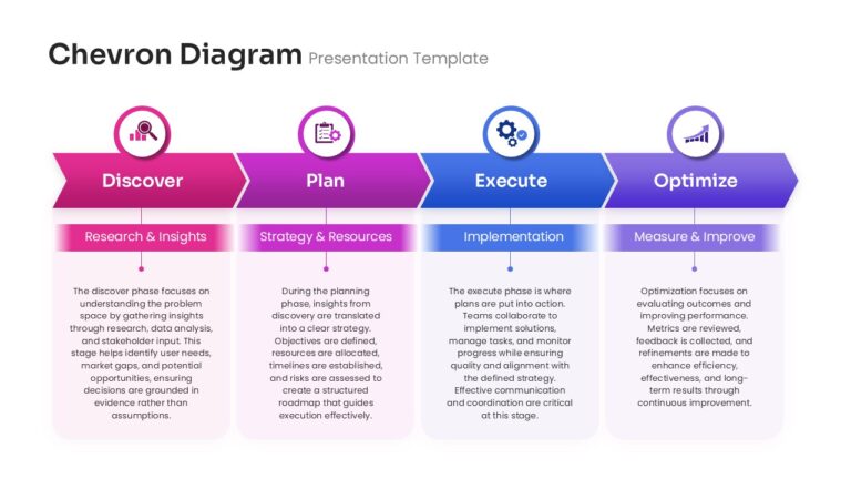 The slide highlights a clear left to right progression using bold chevron shapes. Color transitions help differentiate each phase while maintaining visual harmony. Supporting text blocks below each chevron provide enough space for explanation without clutter, making the slide effective for both presentations and discussions.