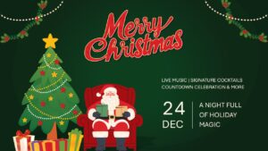 The combination of a cheerful Santa illustration, a bright and fully decorated Christmas tree, and cleanly formatted event text creates an impactful seasonal announcement. The rich green background provides strong contrast, making the message readable while reinforcing the holiday ambiance.