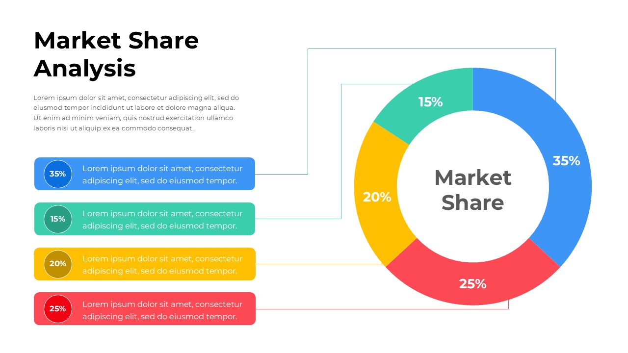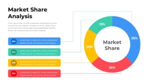 Present your business’s competitive landscape with this Market Share Analysis Template for PowerPoint & Google Slides. Featuring a clean, data-driven donut chart, this slide helps visualize how different companies or products contribute to the total market share. Each segment is color-coded—blue, red, yellow, and green—to clearly distinguish percentage allocations such as 35%, 25%, 20%, and 15%. The right-aligned chart is balanced by editable text boxes on the left, allowing users to label each category, describe performance metrics, and add contextual notes.
