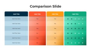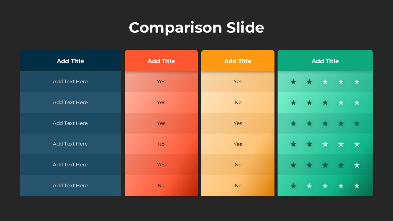 Present data-driven evaluations with clarity using this Colorful Product Feature Comparison Slide Template for PowerPoint and Google Slides. Designed with four vibrant columns in shades of blue, orange, yellow, and green, this slide enables users to display feature comparisons, service tiers, or pricing packages with an eye-catching gradient layout. Each column features a customizable title bar and structured text fields that help organize information clearly, whether you’re highlighting “Yes/No” options, feature availability, or performance indicators with star ratings.