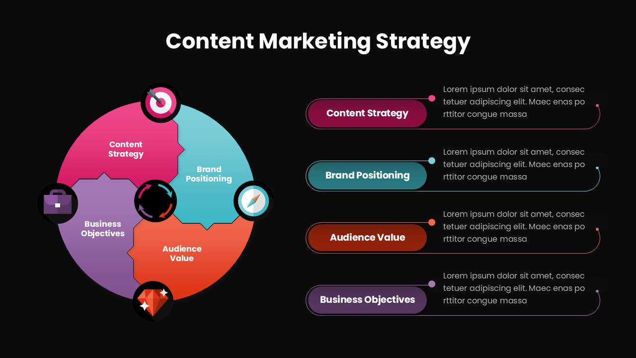 The template features a four-segment circular diagram labeled Content Strategy, Brand Positioning, Audience Value, and Business Objectives, each represented with distinct colors and paired icons. Complementary right-aligned text blocks provide space for concise descriptions or key messages related to each component. All graphic elements—including shapes, colors, icons, and text—are fully editable, allowing users to adapt the slide to match their brand identity or communication needs.