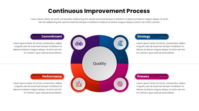 The template features a central circular area labeled quality surrounded by four colored process segments. Each segment represents a core pillar of continuous improvement, supported by icons that visually reinforce the concept. To both sides of the diagram, text blocks detail the four categories: commitment, strategy, performance, and process. The design uses a blend of purple, blue, red, and magenta tones to create visual contrast while maintaining a cohesive structure.