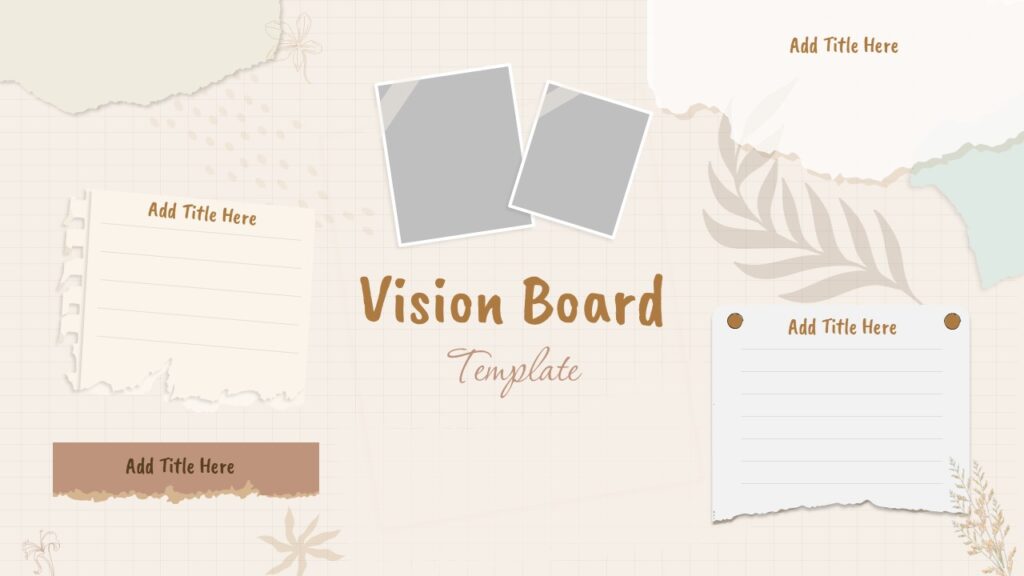 The template includes a single vision board slide featuring multiple content zones for images, handwritten style notes, and short titles. Image placeholders allow users to insert photos or visual references, while paper style note sections provide space for goals, affirmations, or focus areas. The background texture and layered elements create a scrapbook inspired aesthetic without overwhelming the content. Each section is easy to customize or reposition based on individual needs.