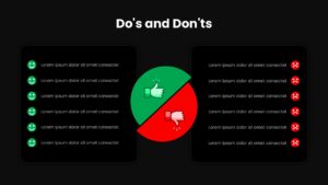 The template features a central circular graphic divided into contrasting halves—green for actionable “Do’s” and red for cautionary “Don’ts.” On either side, neatly aligned text lists reinforce the visual hierarchy, enabling viewers to quickly grasp the difference between positive and negative guidelines. Its minimal aesthetic ensures readability and minimizes distraction, appealing to both corporate and educational settings.