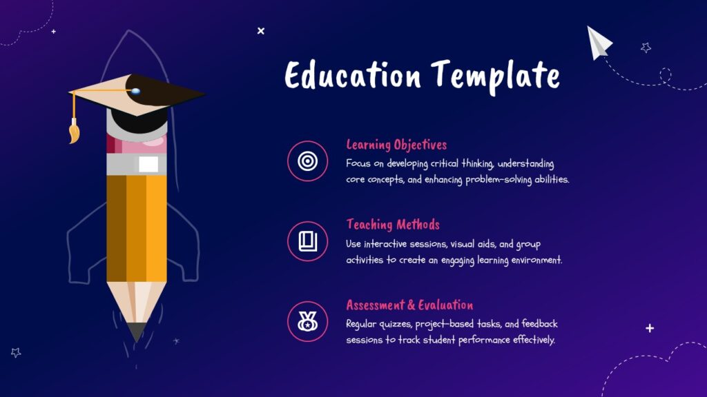 This education focused presentation template is designed to help teachers, trainers, and academic professionals communicate learning objectives, teaching methods, and evaluation strategies with clarity. It is a fully editable presentation template compatible with PowerPoint and Google Slides. Every element can be customized, allowing you to adapt the visuals and text to different grade levels, subjects, or training contexts. The slide features a playful academic theme centered around a pencil character wearing a graduation cap, giving the design an engaging and student friendly appeal.
