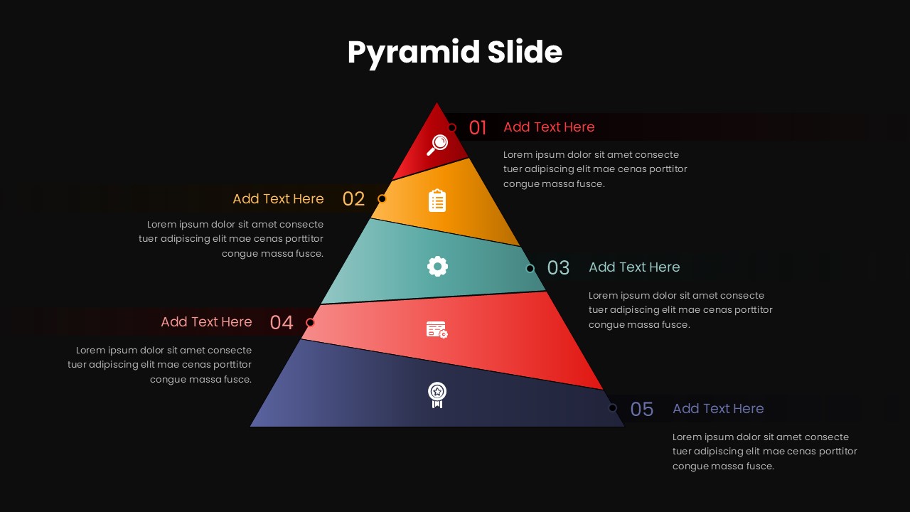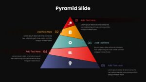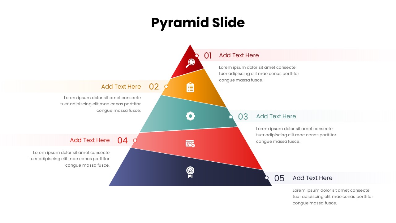 The template features a multi-colored, five-segment pyramid arranged from smallest to largest. Each layer is paired with corresponding text areas placed along both sides of the slide, providing enough room for explanations, labels, or short descriptions. Icons within each layer support quick visual association, and numbered markers help guide the audience through the sequence. The layout is fully editable, allowing you to adapt colors, typography, and content to match your brand or presentation needs.