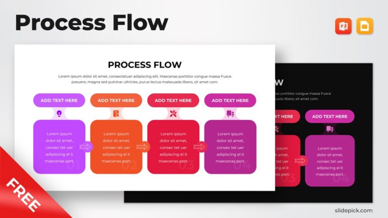 This free four-step process flow template offers a clear and visually engaging way to present sequential stages, workflows, or structured procedures. Designed with bold colors, smooth shapes, and intuitive directional arrows, it helps audiences quickly understand how each step connects to the next. Whether you are outlining an operational process, explaining a strategic roadmap, or breaking down internal procedures, this template delivers clarity without overwhelming your viewers.