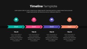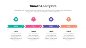 The template features a horizontal timeline spanning four key years—2024 through 2027—each represented with a distinct color block for easy differentiation. Each year includes a circular icon marker, title section, and descriptive text area. These elements work together to provide a cohesive framework for communicating initiatives, phases, achievements, or forecasts. The template’s structured design makes it efficient to tailor for project proposals, annual planning, business strategies, or organizational reporting.