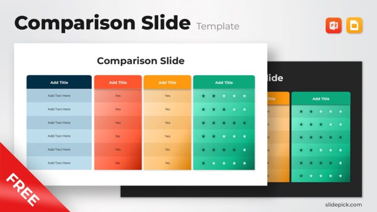 This free Multi-Column Comparison Slide Template offers a clear and visually engaging structure for presenting side-by-side evaluations. Designed with modern gradients and neatly aligned columns, it allows presenters to break down complex information into digestible comparison points. Whether you are showcasing product differences, rating performance, or highlighting feature variations, this template provides an accessible and polished framework suitable for professional and educational presentations.