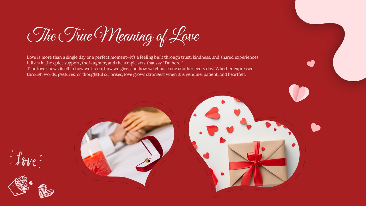 The presentation uses a cohesive red and pink color palette combined with elegant typography and decorative heart elements. It helps convey emotions, stories, messages, or event highlights related to Valentine’s Day while maintaining a polished and professional slide structure. The free nature of the deck makes it accessible for personal, educational, and light commercial use.