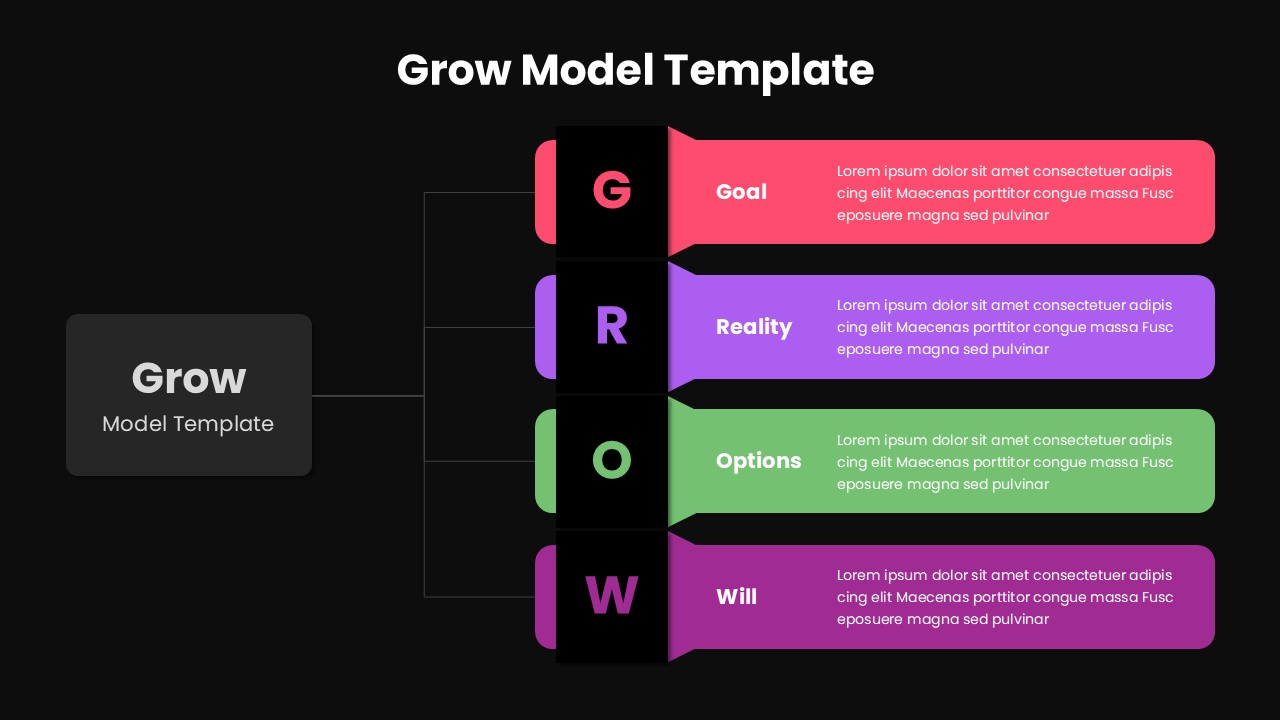 The template contains a single structured slide that breaks down the four pillars of the GROW model. Each section includes a bold letter marker, a color coded label, and space for explanatory text. The Goal area opens the framework by establishing intended outcomes. The Reality block follows with space to describe current conditions or challenges. Options presents alternative paths or solutions, before concluding with the Will segment where commitments and next steps are summarized. The design maintains visual balance and supports quick comprehension.