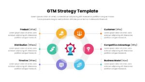 This GTM Strategy slide provides a clear, structured framework for presenting the core components of a go-to-market plan. Designed with a balanced layout and a central strategic icon, it helps teams communicate the essential “Who, What, Why, Where, When, and How” behind any product or service launch. Its circular arrangement supports logical sequencing while emphasizing the interconnected nature of GTM elements, making it ideal for strategic planning workshops, investor decks, and internal briefings.