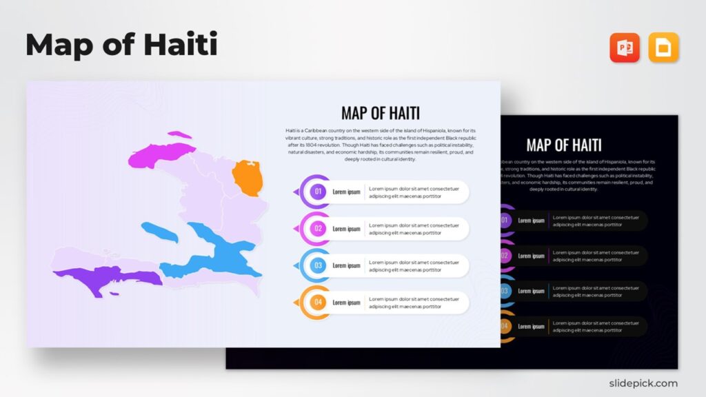 - Main Haiti Map Slide: A multi-color regional map with soft shadows, ideal for presenting geographic distinctions.