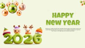 The template includes a single high impact greeting slide with a clean layout. The left section highlights 3D decorative New Year elements, including ornaments and animated style characters positioned within the year 2026. On the right, the text block presents a warm holiday message set in a bold and modern typeface. The overall composition balances imagery and typography, making it suitable for seasonal announcements, internal communications, and event kickoffs. All elements can be edited, including message text, colors, font sizes, and background treatment.