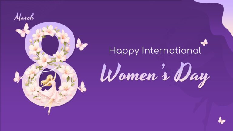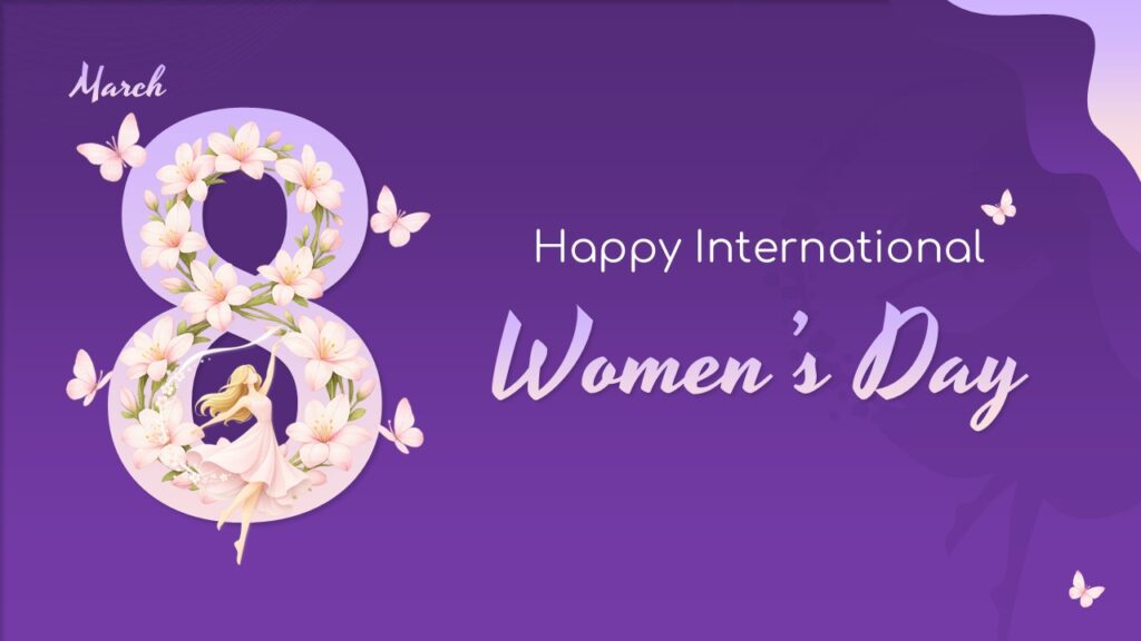 The template features a full slide greeting layout with a prominent floral number 8 that serves as the focal point. A feminine figure is integrated into the design, adding movement and elegance to the composition. The background uses a gradient purple color that enhances contrast and conveys sophistication. Accompanying the central artwork is a clearly displayed “Happy International Women’s Day” message positioned on the right side. Soft butterflies and pastel flowers add delicate accents, balancing the layout with visual harmony.