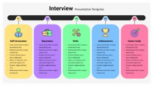 This Interview Overview and Personal Profile Timeline template is designed to help candidates and professionals present their background in a structured and visually clear format. It is a fully editable presentation template, compatible with PowerPoint and Google Slides. The layout highlights key components of a strong interview narrative, including introduction, experience, skills, achievements, and career goals. Its clean multi section format ensures that presenters communicate their profile with confidence and clarity. The template supports users who want to organize their information in an intuitive sequence that aligns with typical interview flows. Each section is color coded and icon supported, making it easy for audiences to follow and interpret the content effectively.