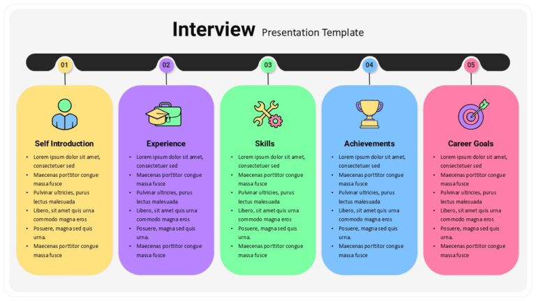 The template features a five step visual timeline that progresses across the slide from left to right. Each step is represented by a rounded rectangular block with a dedicated icon and title. The sections include self introduction, experience, skills, achievements, and career goals. The top line features numbered markers to guide viewers through the sequence. Each block contains ample space for text, allowing presenters to elaborate on key details in a structured manner. The bright color palette and balanced layout create a professional yet engaging presentation style.