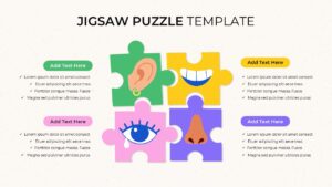 This sensory themed jigsaw puzzle presentation template is designed to help illustrate interconnected concepts using a colorful and visually engaging layout. The product is a fully editable presentation template that works seamlessly in both PowerPoint and Google Slides. As part of our Diagrams templates, It provides a structured yet creative framework for showcasing multi part ideas, educational content, or conceptual relationships. Its playful puzzle motif, combined with symbolic sensory icons, makes it suitable for learning, training, and organizational communication.