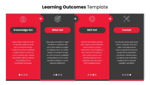 This slide features a four column layout arranged horizontally, with each column representing a distinct learning category. Each section includes a prominent header label, an icon for quick visual recognition, and a dedicated text area for descriptive content. The columns alternate between red and dark backgrounds to create visual rhythm and separation. Navigation arrows at the top guide logical progression from one outcome area to the next, reinforcing the step by step development framework.