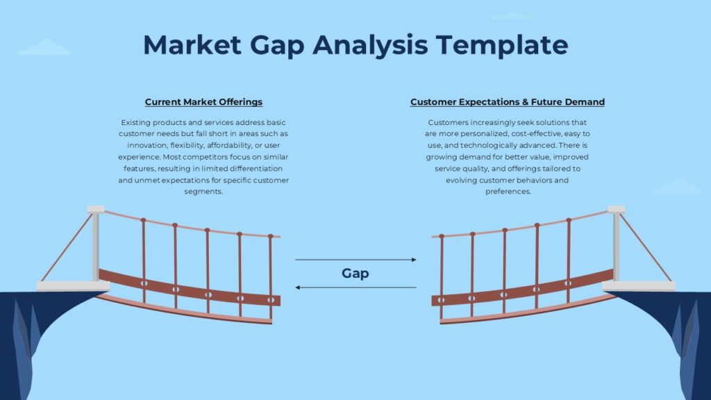 The template features a clean two column layout that compares current market offerings with customer expectations and future demand. Below these sections, a visual depiction of two disconnected bridge segments highlights the concept of a gap between what is provided and what customers seek. The illustration reinforces the analytical narrative by symbolizing the distance between present capabilities and future market requirements. The central label provides space to define the specific gap identified through research or market analysis.