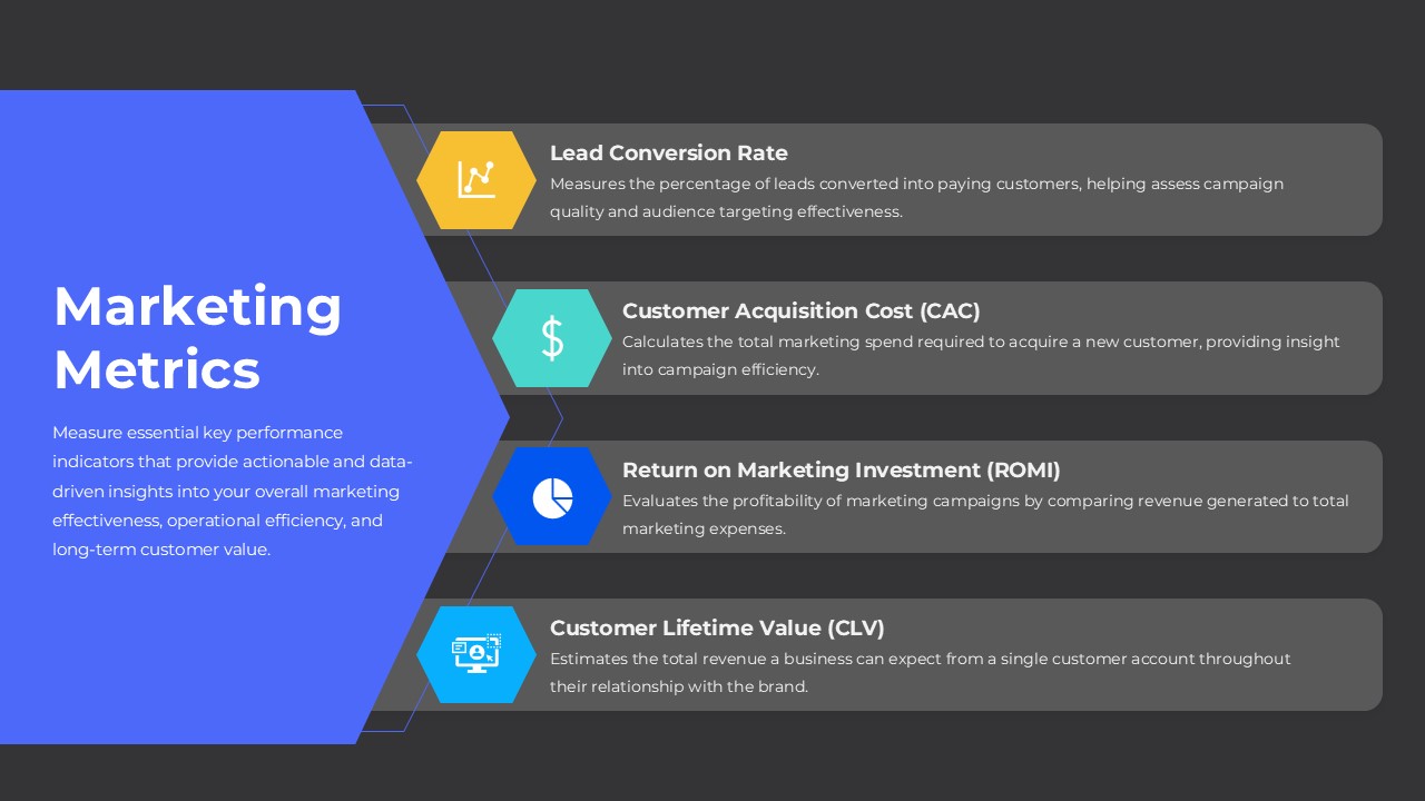 The template includes a sequence of well-organized metric panels that highlight essential marketing KPIs. Each section features a dedicated icon, headline, and concise explanatory text to ensure clarity during presentations. The slide is structured with a bold left-hand title block and four metric cards arranged vertically on the right, creating a balanced and professional look suitable for both internal and external reporting.