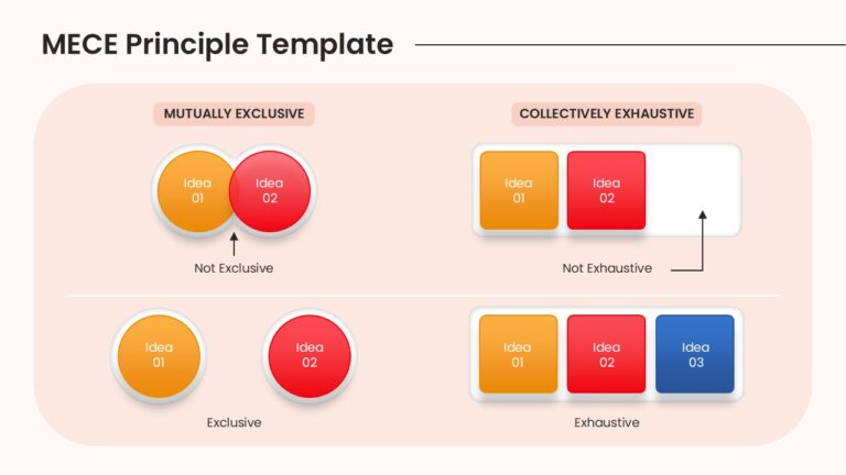 The template includes a single structured diagram divided into two main sections representing mutually exclusive and collectively exhaustive logic. Circular and rectangular shapes are used to demonstrate overlapping versus non overlapping ideas and incomplete versus complete coverage. Each visual example is labeled clearly to show correct and incorrect applications of the MECE principle. The design uses minimal text combined with visual cues such as spacing and alignment to reinforce conceptual clarity. The layout is balanced and presentation ready for executive audiences.