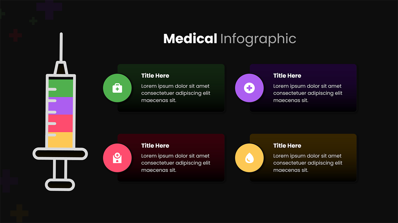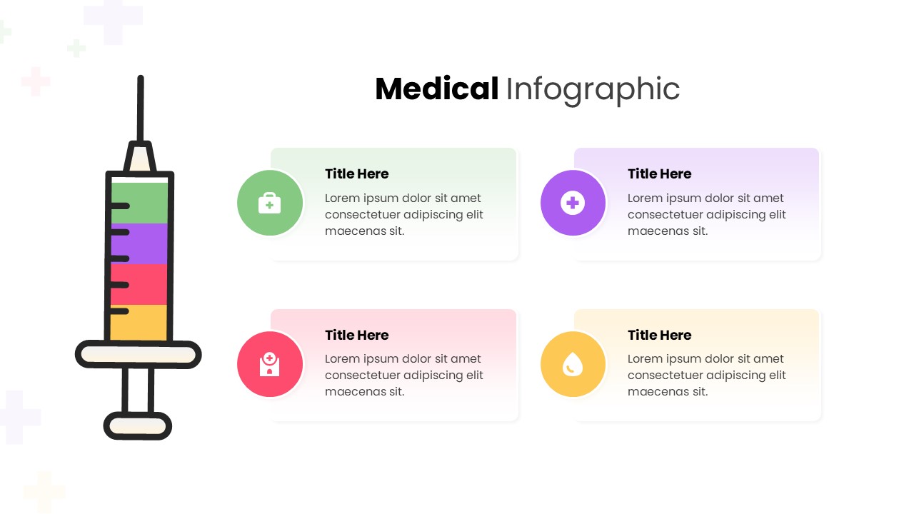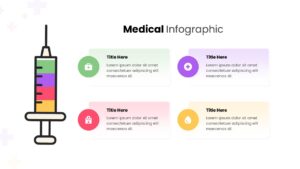 This free medical infographic template is designed to help healthcare professionals, educators, and institutions communicate essential information with clarity and visual appeal. The slide features a clean, modern syringe illustration paired with four neatly arranged content blocks, each supported by distinct color accents and medical-themed icons. Its balanced structure allows users to present procedures, treatment steps, safety guidelines, or patient-care protocols in an easily digestible format.