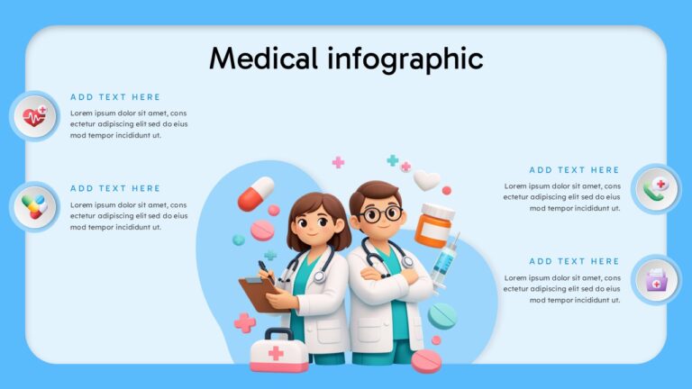 This medical infographic presentation template is designed to help healthcare professionals, educators, and organizations communicate essential information in a clear and visually engaging way. The product is a fully editable presentation template, compatible with PowerPoint and Google Slides. It features friendly 3D style medical illustrations and clean content zones that support informative, patient centered, or training oriented presentations. The soft blue theme and rounded shapes create a welcoming tone suited for clinical, educational, and wellness contexts. Users can personalize text, icons, and layout elements to match their medical topic or branding requirements.