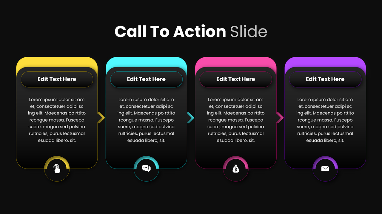 Professionals can use this layout to present onboarding stages, engagement funnels, purchase prompts, workflow directives, or digital marketing action paths. The modern styling makes it suitable for product demos, internal briefings, service explanations, or customer-centric roadmap updates. Its structured four-step progression ensures consistency, while the bright color palette brings energy to any business or marketing deck. Whether used as a standalone call-to-action moment or integrated into a larger process flow, this slide strengthens communication and elevates visual impact.