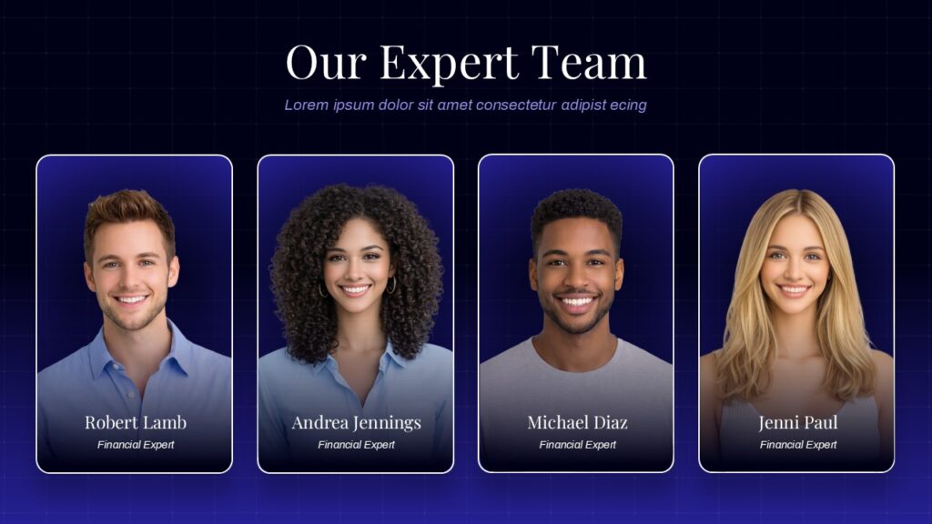 This template is perfect for financial services firms, consulting companies, professional services organizations, and corporate teams looking to showcase their expertise. Marketing directors, HR professionals, business development managers, and company executives will find this template invaluable for client presentations, website content, investor pitches, and company overview materials. The design particularly suits organizations that want to emphasize team credentials and build client confidence through professional presentation of their staff expertise and qualifications.