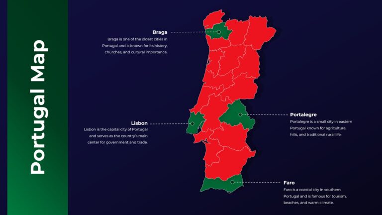 This template presents a visually rich Portugal map designed to highlight key cities and regions with clear callouts. It is a fully editable presentation template compatible with PowerPoint and Google Slides. The slide helps communicate geographic, regional, or location based information in a structured and engaging way. It is ideal for showcasing regional focus, city level insights, or country specific data.