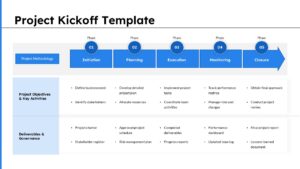 The Project Kickoff Phases Roadmap is a fully editable presentation template designed to outline the complete lifecycle of a project from initiation to closure. Compatible with PowerPoint and Google Slides, it helps teams present methodology, objectives, deliverables, and governance in a clear and structured format. This template supports project managers and stakeholders in aligning expectations, defining responsibilities, and tracking milestones across each phase. It is ideal for formal kickoff meetings, executive briefings, and structured planning sessions.