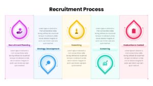The slide highlights the logical progression of recruitment from planning to evaluation. Color coded sections help differentiate stages while maintaining visual harmony. The vertical flow supports storytelling and makes it easy to walk an audience through the hiring lifecycle step by step.