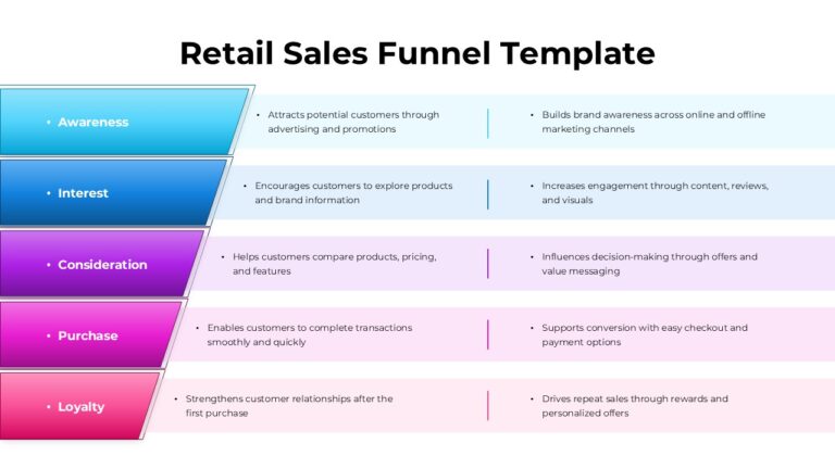 The Retail Sales Funnel Strategy template is designed to visualize the complete customer journey from awareness to loyalty. It is a fully editable presentation template, compatible with PowerPoint and Google Slides. Built for retail and sales teams, it clearly maps each stage of the funnel with structured messaging. The layout helps communicate how prospects move from discovery to repeat purchase in a strategic flow. This template presents five essential stages of the retail sales funnel: Awareness, Interest, Consideration, Purchase, and Loyalty. Each stage is visually separated with bold color blocks and aligned explanatory text areas, making it easy to highlight objectives, tactics, and outcomes at every step. The horizontal structure ensures a logical progression that stakeholders can quickly follow during meetings, reports, or strategy sessions.
