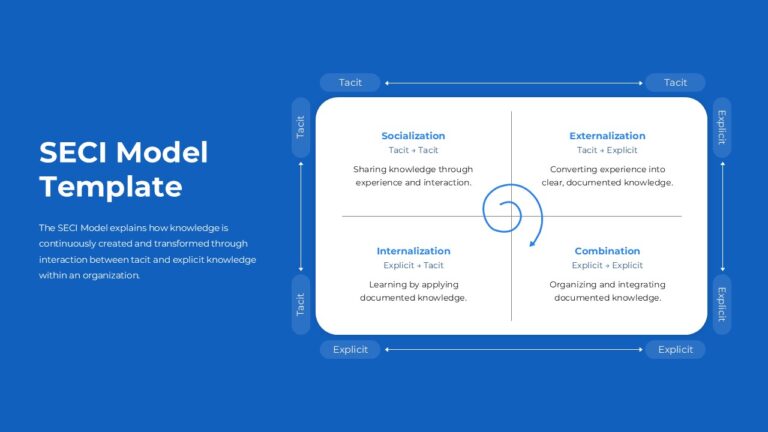 The template features a quadrant layout at the center, representing the four stages of the SECI Model: Socialization, Externalization, Combination, and Internalization. Each quadrant contains a concise title, directional tacit or explicit transition, and a short description to clarify its role in knowledge creation. Surrounding arrows and labels highlight the continuous movement between tacit and explicit knowledge. A spiral graphic reinforces the idea of ongoing development. The left section includes a clean textual introduction, helping set context before presenting the model itself. The color scheme balances blue tones with white space to ensure readability and a professional appearance.