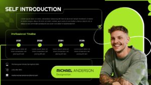 This professional self introduction template combines sleek visual design with practical functionality to help you make memorable first impressions. The template features both light and dark theme variations, allowing you to choose the perfect aesthetic for your presentation environment. Completely editable in both Microsoft PowerPoint and Google Slides, this template transforms your personal story into a compelling visual narrative with dedicated sections for timeline milestones, contact information, and professional photography. The modern design with vibrant lime green accents and clean typography ensures your introduction stands out while maintaining professional credibility.